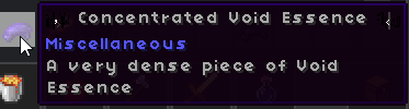 <figure><img src="https://3417555188-files.gitbook.io/~/files/v0/b/gitbook-x-prod.appspot.com/o/spaces%2FGoD4fjcpxwD7mhC5VDhl%2Fuploads%2FXnvQ6almwdwpjCWAT6PJ%2Fimage.png?alt=media&#x26;token=557e62a0-9fbb-4f3c-825c-f468621d8615" alt=""><figcaption><p>Concentrated Void Essence</p></figcaption></figure>
