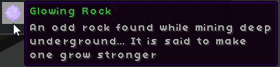 Glowing Rock is a consumable type of shadow material used to gain back permanent health. They can be randomly found by digging below 40 on the Y-axis.