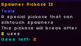<figure><img src="https://3417555188-files.gitbook.io/~/files/v0/b/gitbook-x-prod.appspot.com/o/spaces%2FGoD4fjcpxwD7mhC5VDhl%2Fuploads%2FVoVDyHAQS296cbtbg9dN%2Fimage.png?alt=media&#x26;token=7bcdeac3-f97e-4d80-91a5-242fd70af01e" alt=""><figcaption><p>Spawner Pickaxe II</p></figcaption></figure>